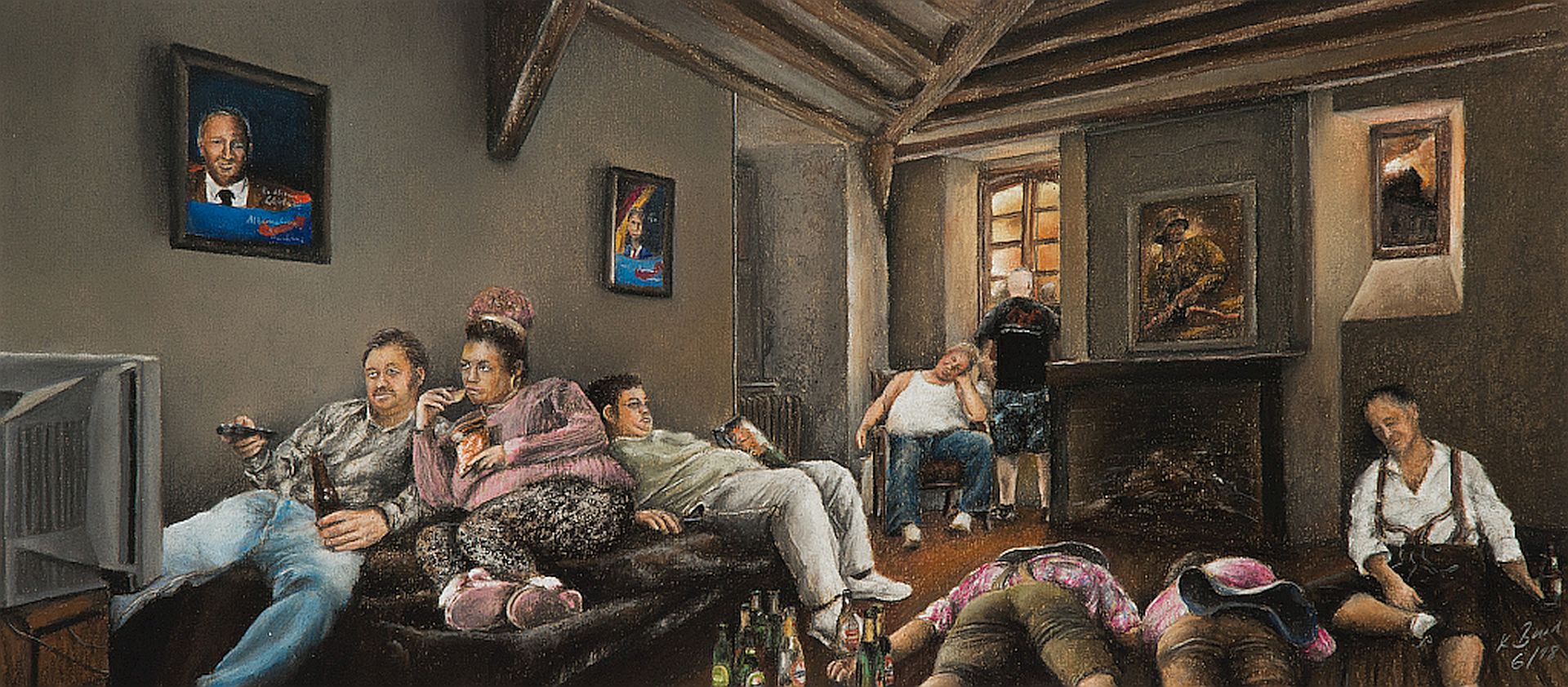 | RTL II oder German Leitkultur (2018) Pastellkreide 48 x 22 cm Das dreizehnte Bild aus der Serie "Narrenspiegel". Unter den entlarvenden Plakaten liegen die Couch-Potatoes und ergötzen sich an Reality-Soaps und Fake-News, im Hintergrund erfreut sich ein auffallend kahlköpfiger junger Mann an der brennenden Asylunterkunft draußen vor dem Haus Haus und der Hemdsärmlige davor verschläft all das ebenso wie die drei Herren im Vordergrund nach ihrem Gelage. Ein deutsches Sittenbild. Fritz Bauer fragte einmal sinngemäß, wie wir es wagen können, stolz auf Goethe und Schiller zu sein, denn wir haben deren Werke nicht geschrieben. Ich würde das dahin weiterspinnen, dass ein Großteil derer, die heute lauthals eine deutsche Leitkultur propagieren, diese Werke nicht nur nicht geschrieben haben, sondern auch nie freiwillig lesen würden. Worauf können wir also stolz sein? Doch nur auf das, was wir auch selbst geleistet haben. Und was soll dann eine deutsche Leitkultur sein? Deutsche Dieselautos? Florian Silbereisen und Helene Fischer? Fünf Minuten RTL II dürften ausreichen, jeden Antwortversuch im Keim zu ersticken... |