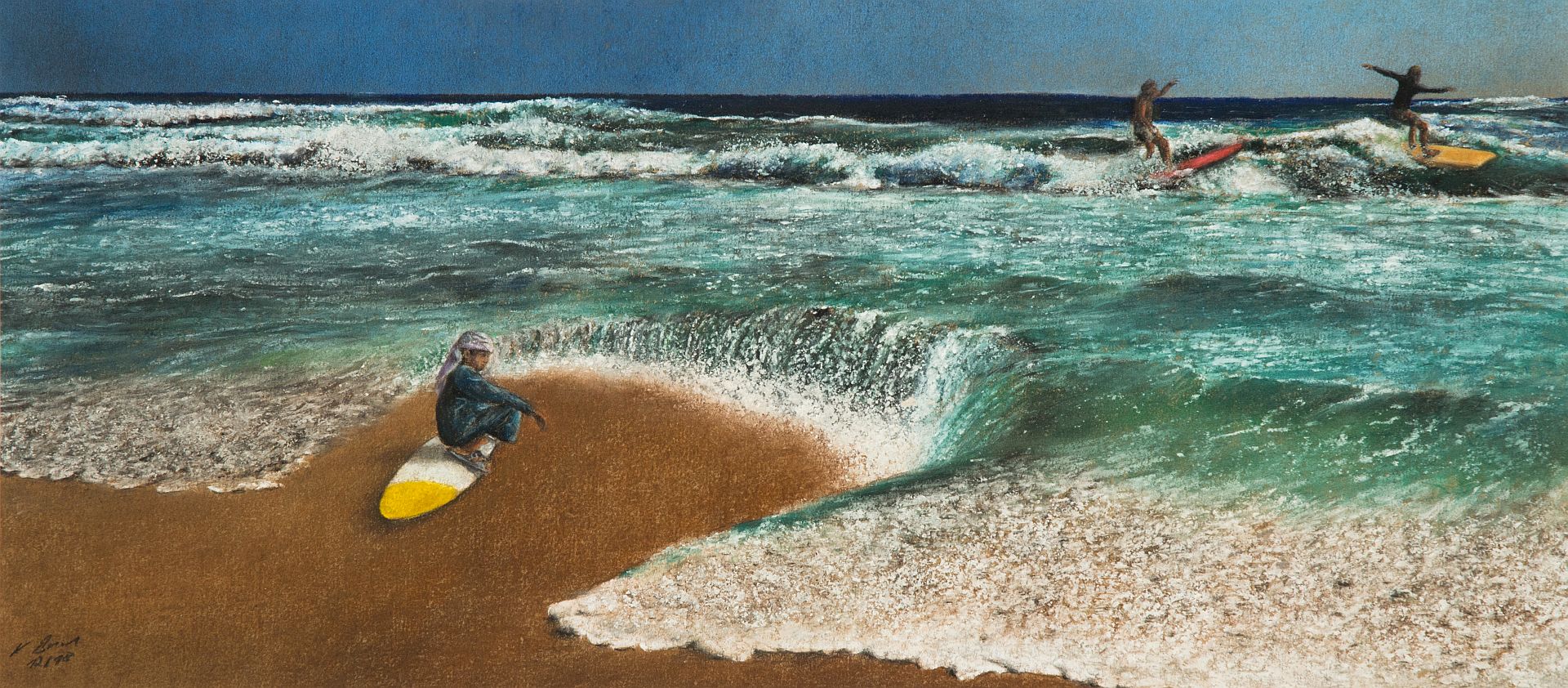 | Warum der junge Moses nie das Surfen lernte (2018) Pastellkreide 48 x 22 cm Das neunzehnte Bild aus der Serie "Narrenspiegel". Warum der junge Moses nie das Surfen lernte? Weil sich das Meer immer gleich teilte... Neben allem Spaß an der Absurdität des Bildmotivs ist das Bild auch ein Plädoyer für die Vorzüge der "Normalität" zu mancher Zeit. Außergewöhnlich begabte Menschen sind häufig mit ebenso außergewöhnlichen Ansprüchen und Erwartungen an ihre Person konfrontiert. Das macht das Leben für diese Menschen nicht immer einfacher. Viele scheitern auch daran. So, wie der junge Moses am Surfen scheitert. Man kann seinen Wunsch förmlich spüren, manchmal auch einfach normal sein zu dürfen. |