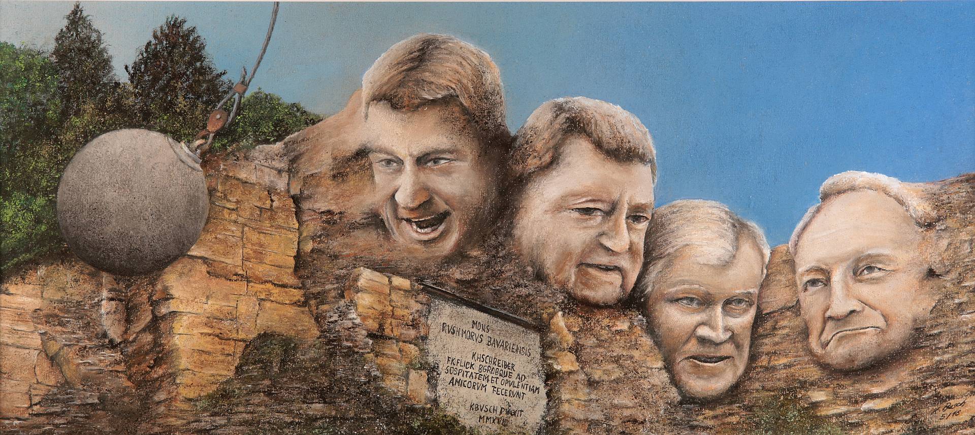 Das elfte Bild aus der Serie "Narrenspiegel". Einstellungsvoraussetzung für den Beruf des bayerischen Ministerpräsidenten scheint in erster Linie ja zu sein, dass der Nachname mit „S“ beginnt. Beginnt er mal mit „B“, dann ist die entsprechende Person auch gleich vergessen. Und man sieht sich ja so gerne als Nabel der Welt. Naheliegend also in den Träumen der Herren S., aus einem der zahlreichen Steinbrüche des von ihnen so nachhaltig zerstörten Altmühltales den Bavarian Mount Rushmore zu machen. Die Amigo-Consult wird es schon zahlen, oder? Doch jedes Denkmal beginnt irgendwann zu bröckeln. Mal mit mehr, mal mit weniger Nachdruck. Das aber ist der Alptraum der Herren S.… Einjuriert in den Marler Kunststern 2018 zum Thema "Skurril" |
