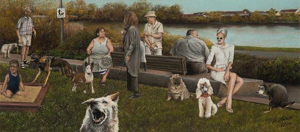 Das neununddreißigste Bild aus der Serie "Narrenspiegel". „Wie der Herr so’s Gescherr“, lautet ein deutsches Sprichwort, das vermutlich auf den Satz „Plane qualis dominus, talis et servus“ (Wie der Herr, so auch der Sklave) aus Titus Petronius Satyricon zurückgeht. Im Altgriechischen gab es ein Äquivalent, das übersetzt „Wie die Herrin, so die Hündin“ lautete. Und da schließt sich der Kreis. Wessen Kinder sich im Sandkasten schon einmal in den Hundehaufen gesetzt haben, wer es jemals wagte, in einem öffentlichen Park etwa zehn Meter über die Wiese zu gehen, oder wer sich schon einmal als Radfahrer aus der gefühlt 30 Meter langen Hundeleine der gerade im Gespräch mit ihrer Begleiterin vertieften Besitzerin des daran hängenden Chihuahua befreien musste, wird wissen, was ich meine. Hunde sind soziale Wesen. Ihre Herrchen und Frauchen nicht immer. Die beanspruchen gerne einmal die mindestens 100 Quadratmeter um sie herum als nur ihnen und ihrem vierbeinigen Spiegelbild vorbehaltenen Raum. Egal, ob da zufällig ein Radweg verläuft, ein Spielplatz ist oder eine Parkbank steht. Das trifft definitiv nicht auf alle zu. Es gibt gut erzogene Hunde mit verantwortungsvollen Besitzer*innen. Ich kenne einige auch persönlich und schätze sie sehr. Aber Sätze wie „Der will nur spielen“, „Das hat er ja noch nie getan“ oder „Wacki, jetzt komm doch mal zu Mutti“ lösen bei mir gerne mal allergische Reaktionen aus. Irgendwie wird in diesen Mensch-Hund-Verhältnissen irgendetwas merkwürdig kompensiert. So ist es gerade auch in links-alternativen Kreisen bei sich in der Regel paleo-frugan-vegan ernährenden (zumeist) Frauen weit verbreitet, sich mit einem mindestens einen Meter großen fleischfressenden Monster zu umgeben. Auf diversen Festivals, DAMs und ähnlichen Veranstaltungen, wenn ich wieder über solch einen “freien Hund einer freien Bürgerin“ gestolpert bin, von diesem abgeschleckt wurde oder mir einen anderen Zelteingang suchen musste, habe ich mir schon die „Warum“-Frage gestellt. Aber nur ganz leise. Sonst bin ich ja gleich ein Macho. Ein böser tierhassender Macho. Ein böser tierhassender Macho, der ab und zu auch mal gerne (pfui!) dem Hund eine Bratwurst wegisst…. |
